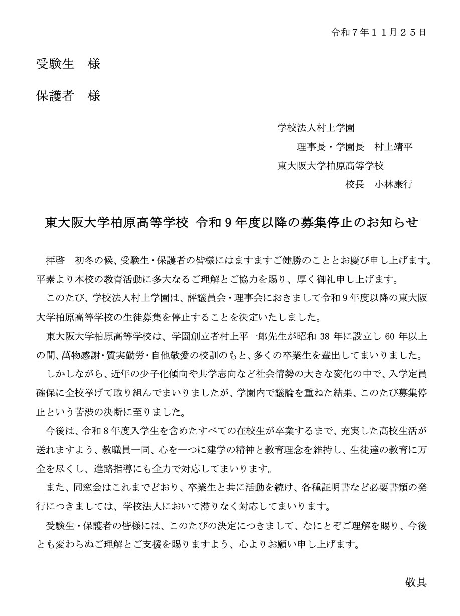 東大阪大学柏原高等学校の募集停止が発表されました。
